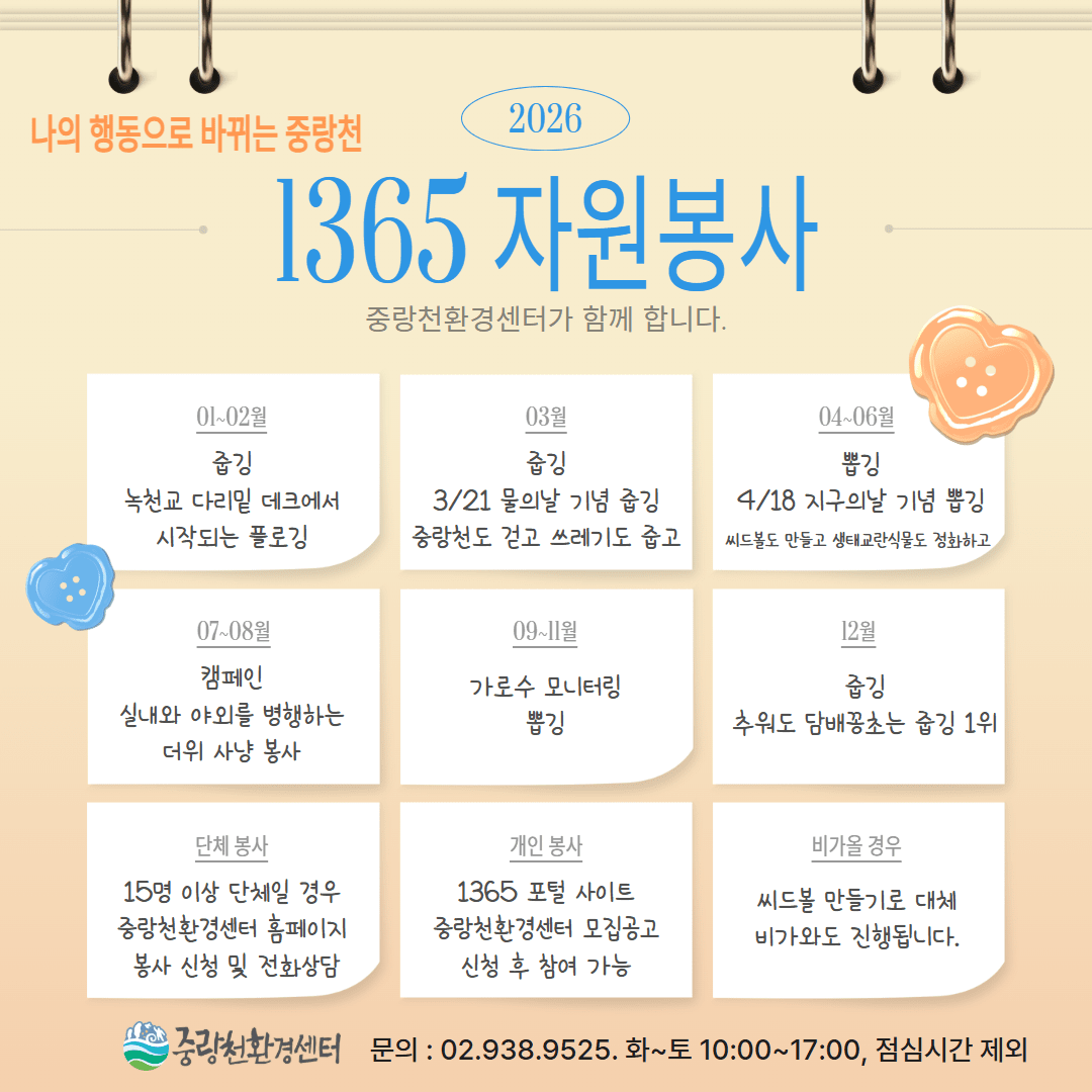 * 신청시 주의 : 2026년 2~3월은 센터 증축 공사 마무리 작업으로 인해 하천 자원봉사가 녹천교 다리밑에서 진행될 수 있습니다.