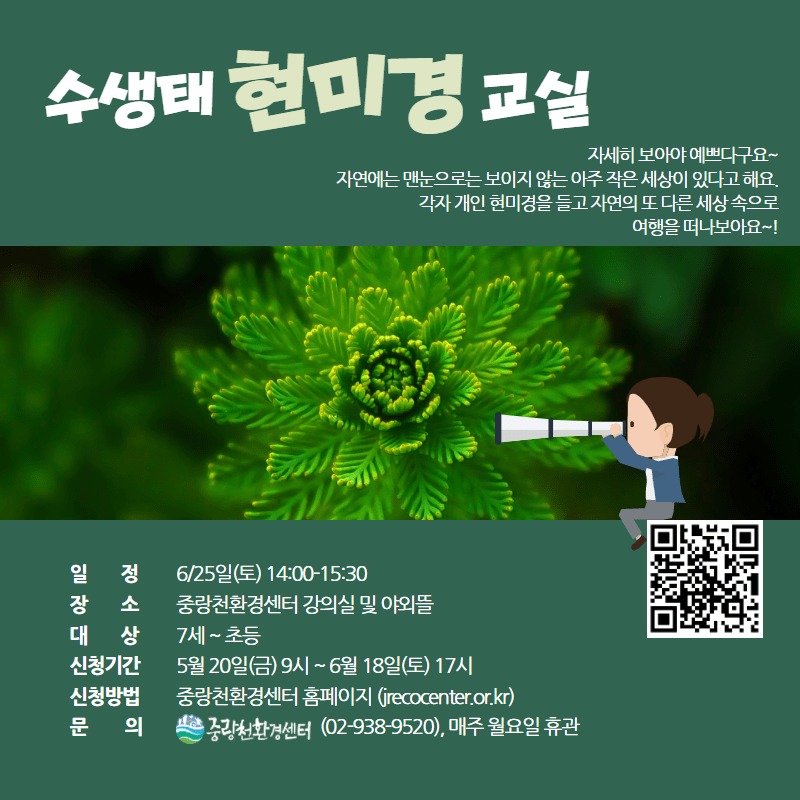 - 신청방법 : 중랑천환경센터 홈페이지 (jrecocenter.or.kr) -> 교육 프로그램 -> 프로그램 신청