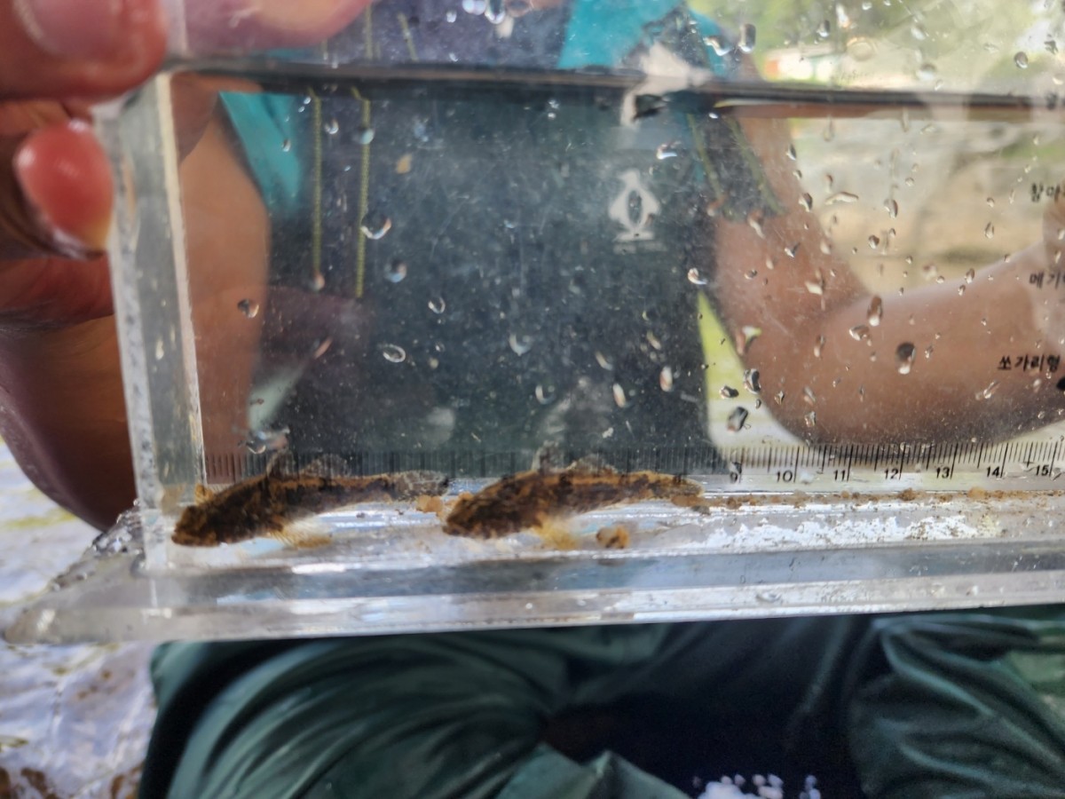 누구일까? 얼룩동사리가 잡혔어요. 얼룩동사리 인사하고, 재빠르게 중랑천에 놓아주어요.