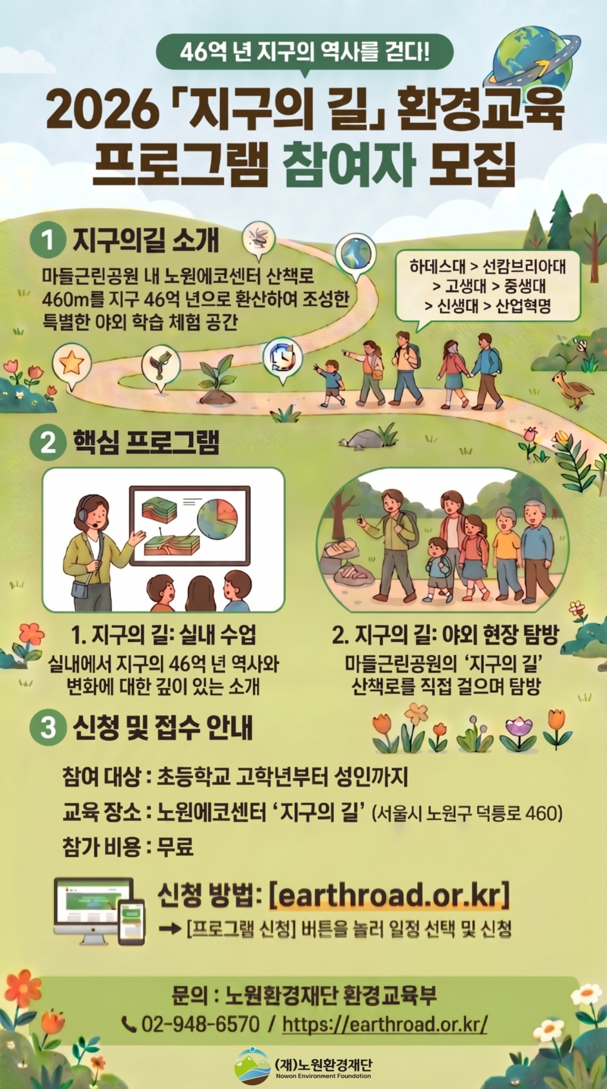 생태계를 직접 탐방하며 환경의 소중함을 배우는 특별한 환경교육 프로그램, '지구의 길'이 시작됩니다. 노원환경재단의 전문 해설사와 함께하는 다채로운 교육과 체험이 준비되어 있으니, 많은 관심과 참여를 부탁드립니다. 자세한 사항은 아래 안내 및 첨부된 포스터를 확인해 주시기 바랍니다.
