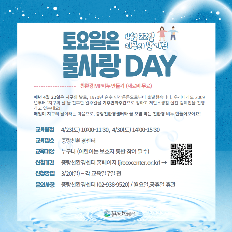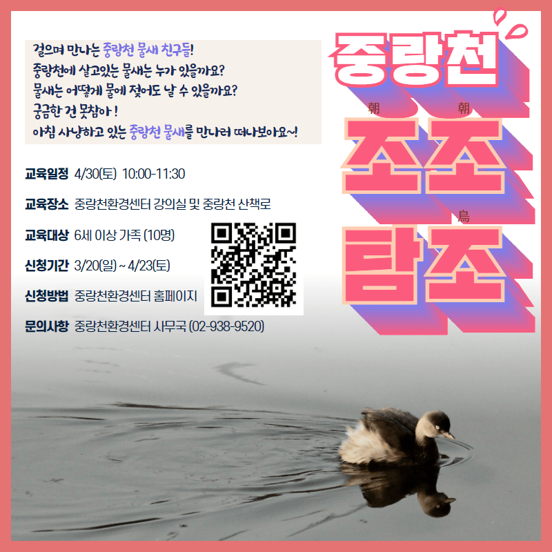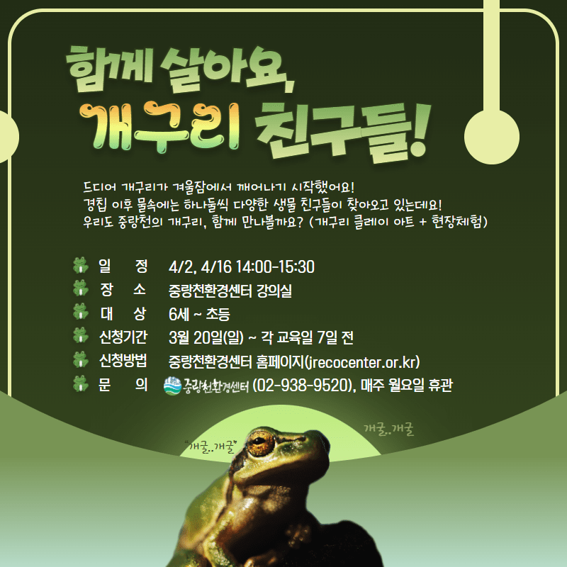 안녕하세요. 중랑천환경센터 4월 개인 프로그램 신청 안내드립니다. - 신청 기간 : 3월 20일(일) ~ 각 교육일 7일 전까지 - 진행 프로그램 : 수생태 현미경 교실 / 함께 살아요, 개구리 친구들 ! / 토요일은 물사랑 DAY / 중랑천 조조탐조 - 신청 바로가기 (클릭)