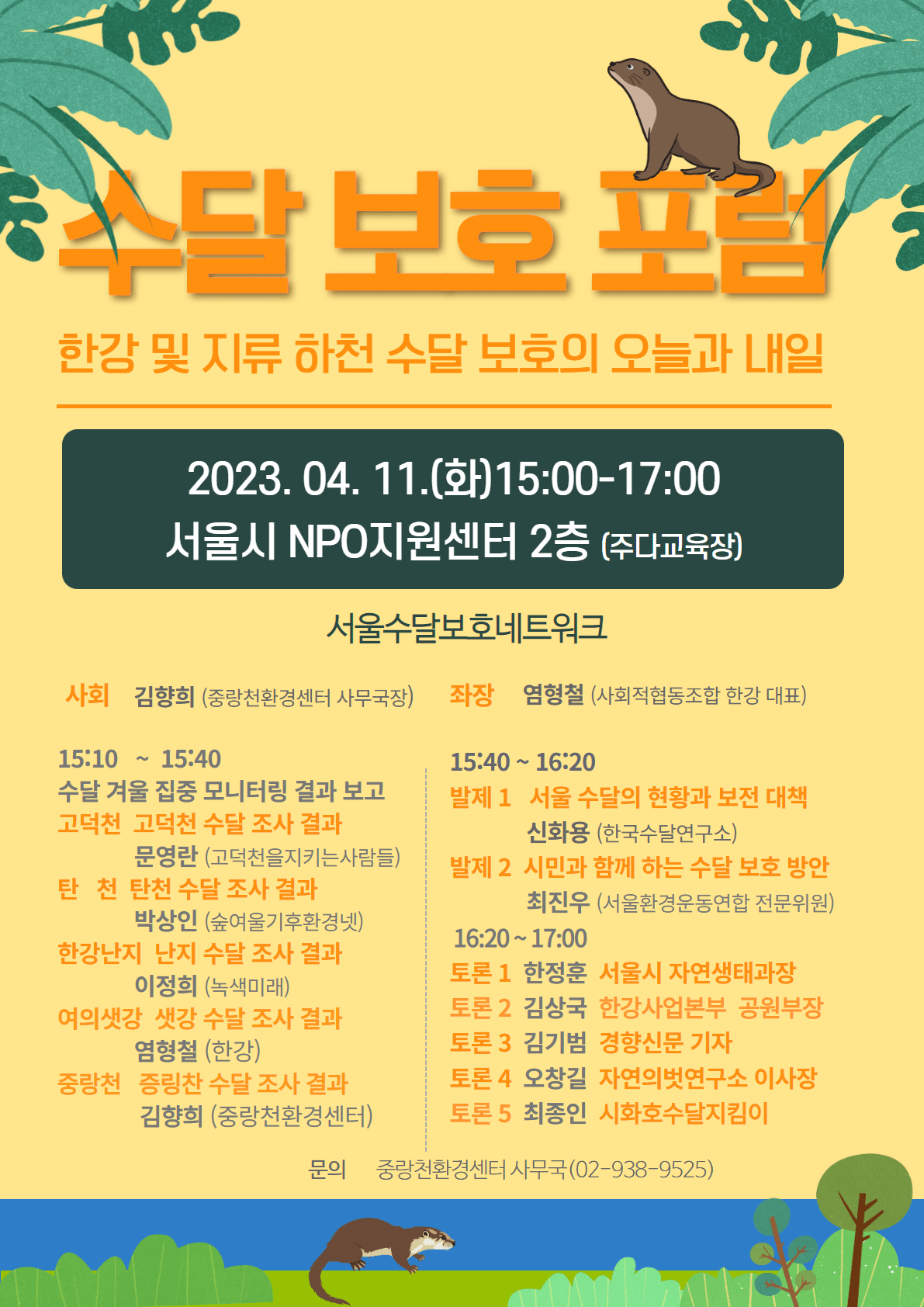 2022년 11월 ~ 2023년 3월 서울 한강과 도시하천의 수달 모니터링 결과를 공유하고, 수달 보호 방안에 대한 토론회를 개최합니다.