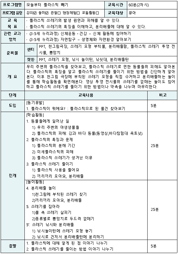 단체 환경교육 신청자를 위한 프로그램 안내입니다 교육계획안 및 교육 사진을 참고해 주세요 감사합니다 >>>오늘부터 플라스틱 빼기 교육계획안 >>>센터방문 환경교육 예시 >>>찾아가는 환경교육_오늘부터 플라스틱 빼기