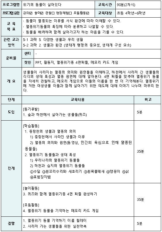 단체 환경교육 신청자를 위한 프로그램 안내입니다 교육계획안 및 교육 사진을 참고해 주세요 감사합니다 >>>위기의 동물이 살아있다(4~6학년) 교육계획안 >>>찾아가는 환경교육 _메모리게임, 4면 퍼즐 활동 예시